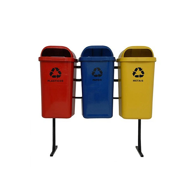 Opções: 3 lixeiras (papel, plástico, metal)